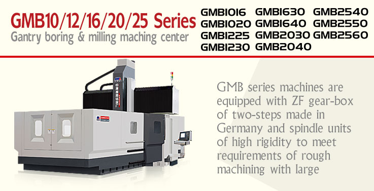 GMB series machines are equipped with ZF gear-box of two-steps made in Germany and spindle units of high rigidity to meet requirements of rough machining with large torque in low speed, as well as precision machining with high speed. The design of cross beam in large section area and guide-ways of step construction have been combined perfectly to increase stability during cutting. The machines can be equipped with different accessories such as high rigidity milling head to realize five-side machining.